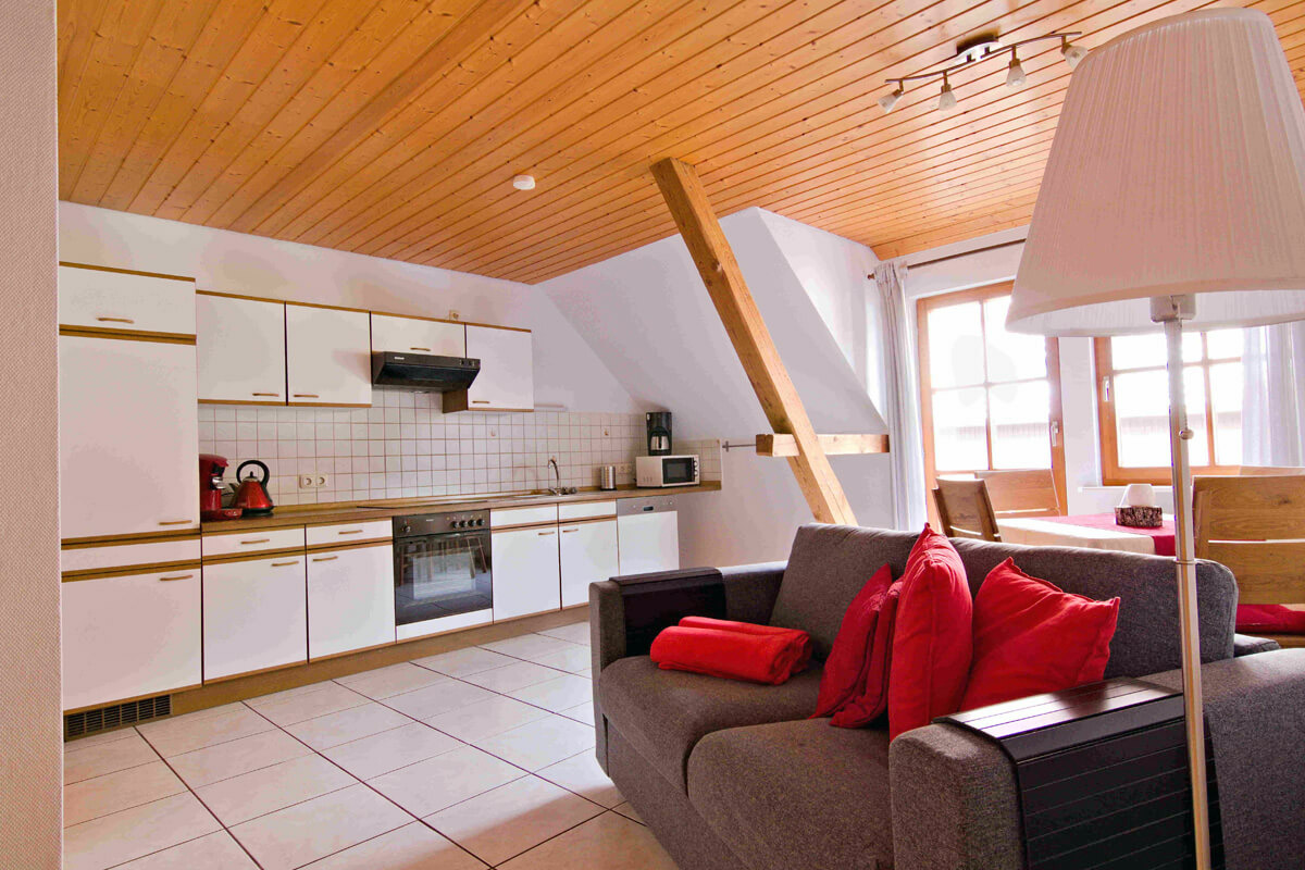 - Wohnküche mit Küchenzeile, Esstisch, Stühlen, Ecke mit Couch, Sessel und TV