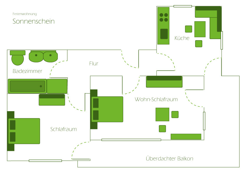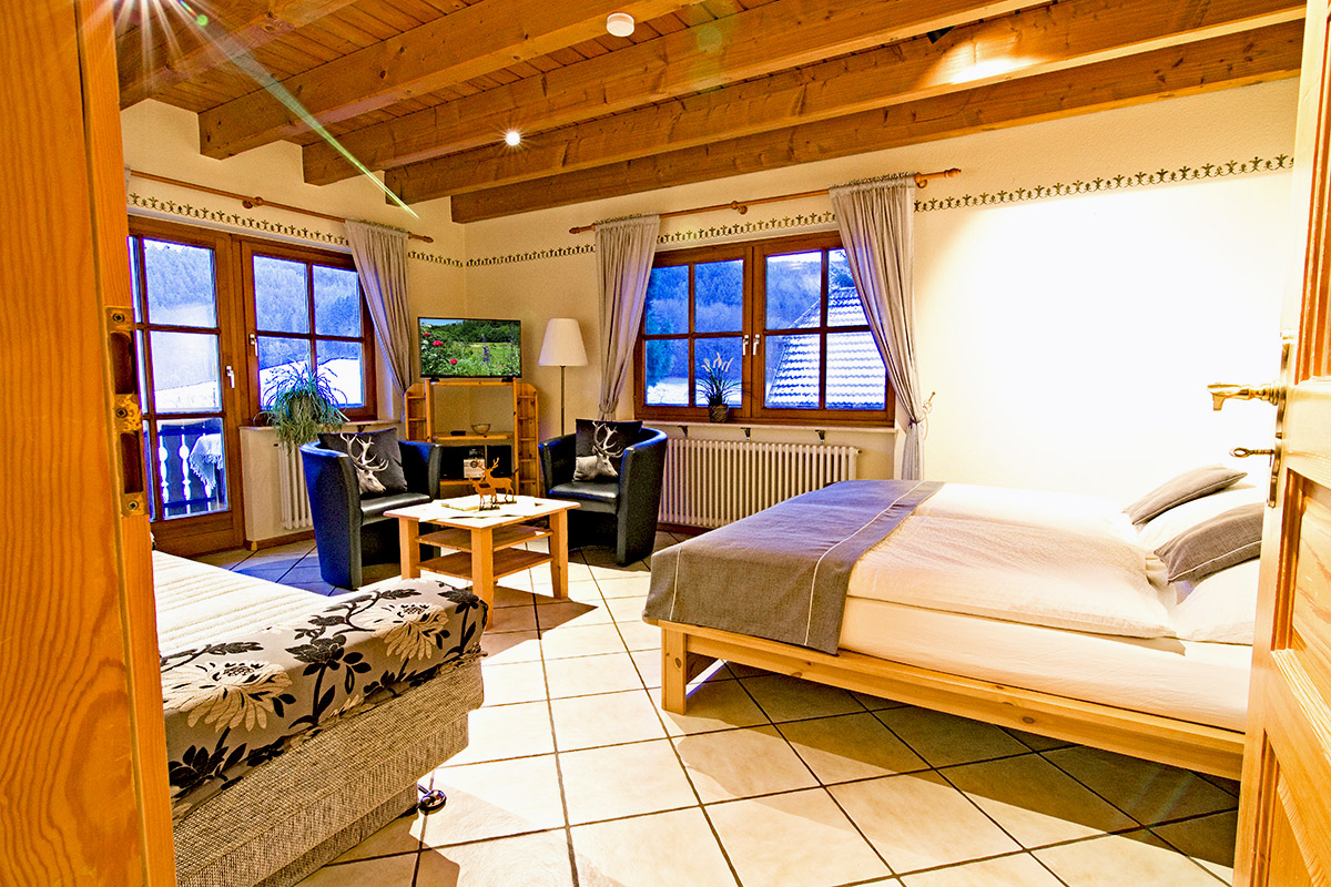 Das Apartment Sonnenschein bietet auf 85 m² plus großem überdachtem Balkon viel Platz für entspannte Urlaubstage auf unserem Ferienbauernhof. Die gemütliche Ferienwohnung ist für bis zu fünf Personen geeignet.