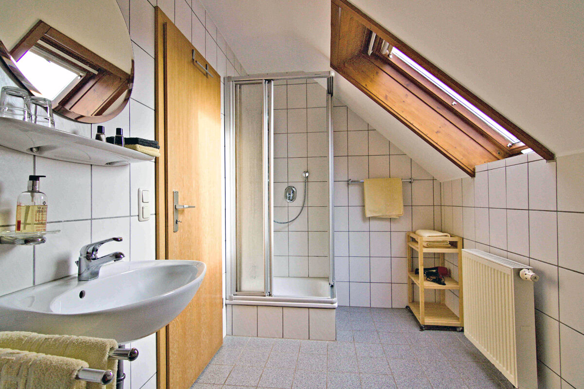 Couch, Sessel und TV - Badezimmer mit Dusche, Waschbecken und WC