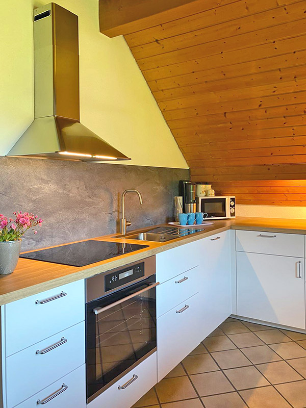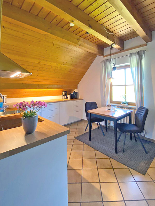 - Voll ausgestattete Wohnküche mit Küchenzeile, Esstisch und Stühlen