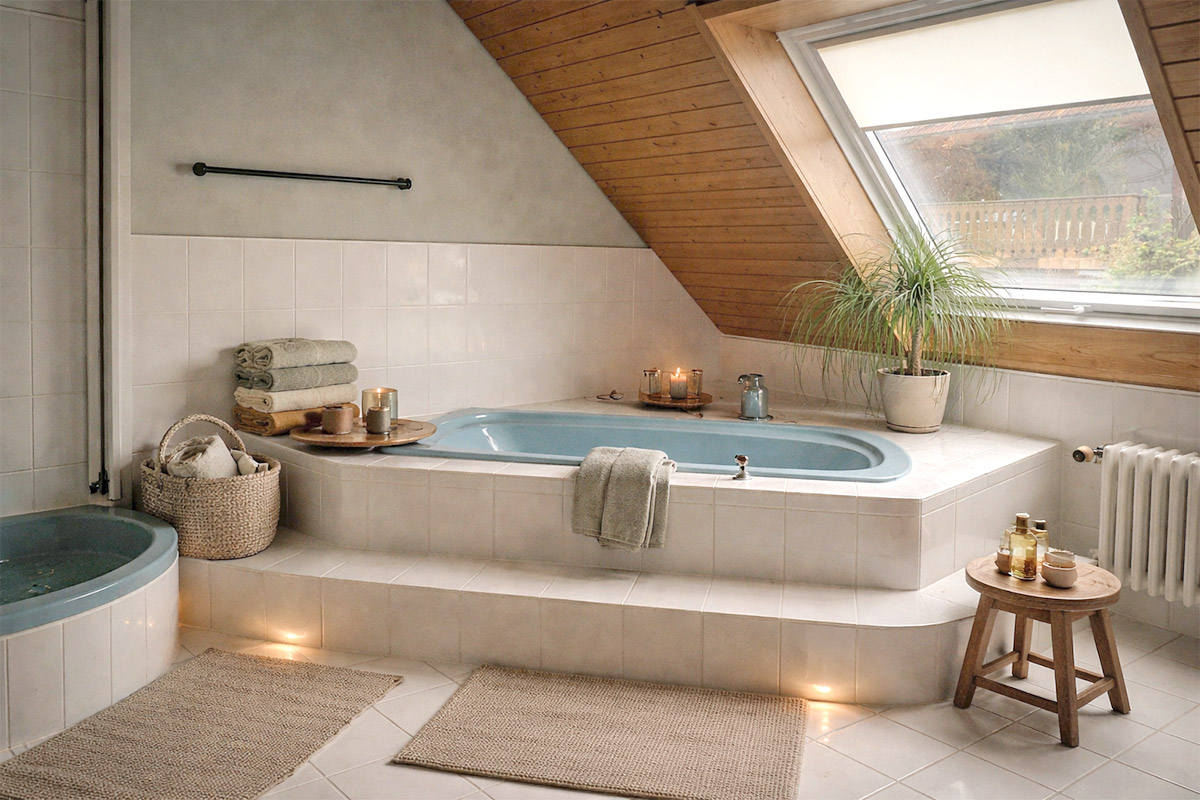 - Luxus-Badezimmer mit Badewanne, Dusche, Waschbecken und WC