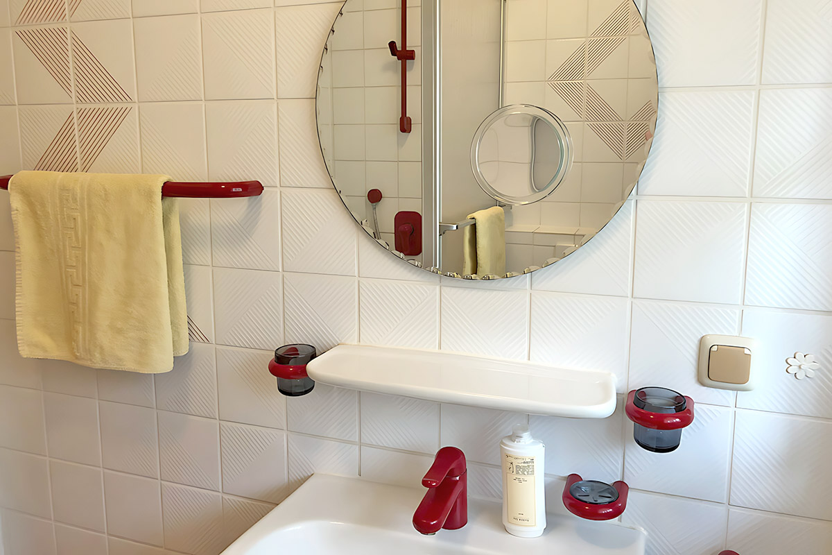 Essecke und TV - Badezimmer mit Dusche, Waschbecken und WC