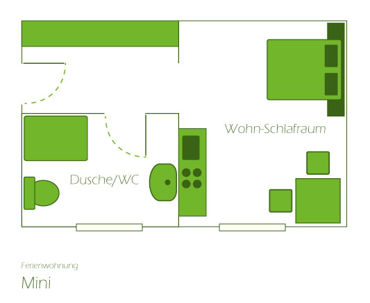 - 1 Schlafraum (franz.Bett 150×200) mit Miniküche,