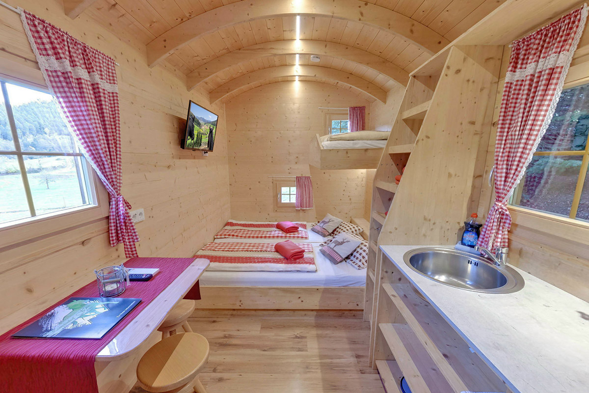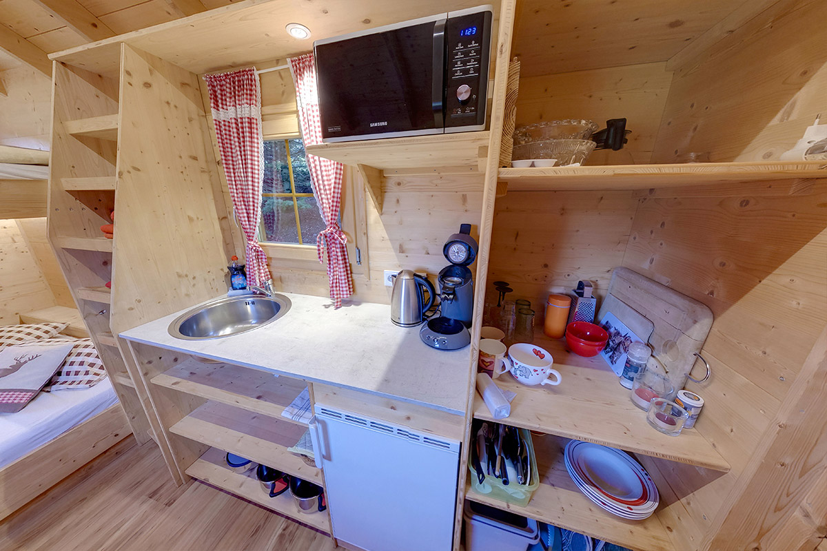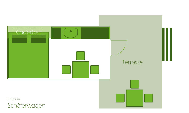 Der Wagen bietet Platz für 2 Erwachsene und 1 Kind. Eine voll ausgestattete Küchenzeile, gemütlicher Schlafbereich mit TV sowie Sitzplätze innen und außen sorgen für Komfort. Heizung und Klimaanlage ermöglichen ganzjährigen Aufenthalt. Private Dusche/WC im nahegelegenen Haupthaus, eigener Grillplatz und Parkplatz direkt am Wagen inklusive.