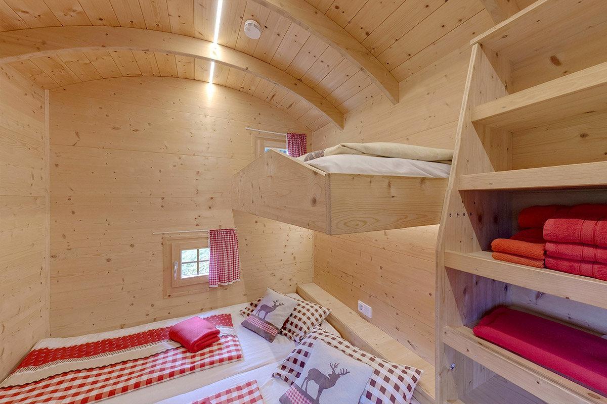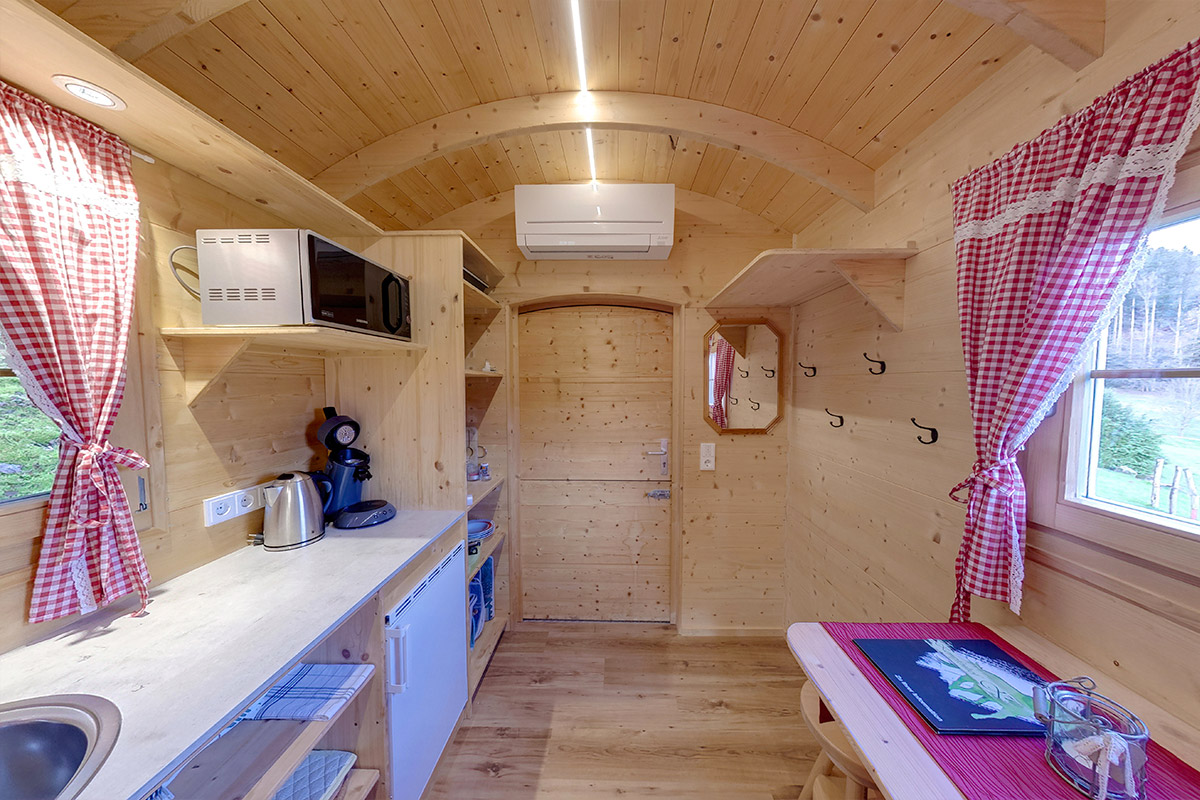 Genießen Sie eine besondere Auszeit in unserem liebevoll gestalteten Schäferwagen auf dem Ferienbauernhof. Vom eigenen Freisitz aus blicken Sie auf Wald und Tal – Natur pur und absolute Ruhe.